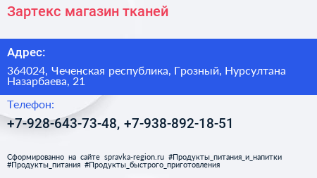 Зартекс, магазин тканей по адресу 364024, Чеченская республика, Грозный, Нурсултана Назарбаева, 21 в дальнейшем Организация, размещена в следующих категориях: