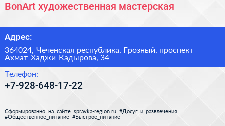 BonArt, художественная мастерская по адресу 364024, Чеченская республика, Грозный, проспект Ахмат-Хаджи Кадырова, 34 в дальнейшем Организация, размещена в следующих категориях: