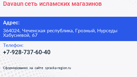 Davaun, сеть исламских магазинов по адресу 364024, Чеченская республика, Грозный, Нурседы Хабусиевой, 67 в дальнейшем Организация, размещена в следующих категориях: