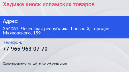 Хадижа, киоск исламских товаров по адресу 364061, Чеченская республика, Грозный, Городок Маяковского, 159 в дальнейшем Организация, размещена в следующих категориях: