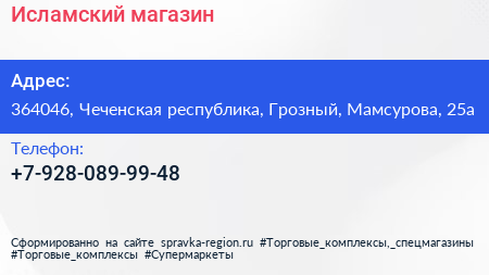 Исламский магазин по адресу 364046, Чеченская республика, Грозный, Мамсурова, 25а в дальнейшем Организация, размещена в следующих категориях: