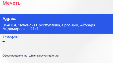 Мечеть по адресу 364014, Чеченская республика, Грозный, Абузара Айдамирова, 141/1 в дальнейшем Организация, размещена в следующих категориях: