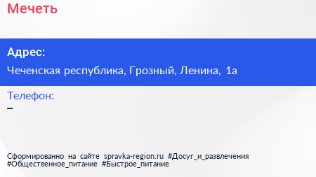Мечеть по адресу Чеченская республика, Грозный, Ленина, 1а в дальнейшем Организация, размещена в следующих категориях: