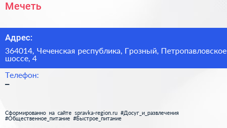 Мечеть по адресу 364014, Чеченская республика, Грозный, Петропавловское шоссе, 4 в дальнейшем Организация, размещена в следующих категориях:
