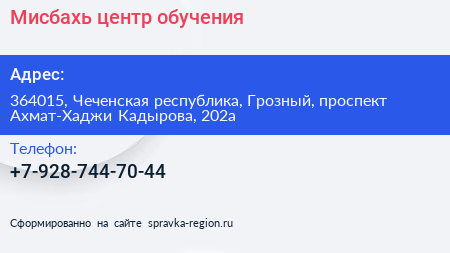 Мисбахь, центр обучения по адресу 364015, Чеченская республика, Грозный, проспект Ахмат-Хаджи Кадырова, 202а в дальнейшем Организация, размещена в следующих категориях: