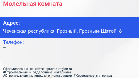 Молельная комната по адресу Чеченская республика, Грозный, Грозный-Шатой, 6 в дальнейшем Организация, размещена в следующих категориях:
