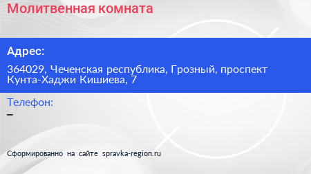Молитвенная комната по адресу 364029, Чеченская республика, Грозный, проспект Кунта-Хаджи Кишиева, 7 в дальнейшем Организация, размещена в следующих категориях:
