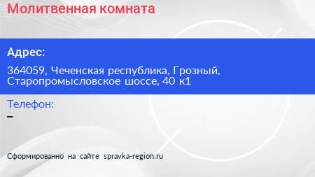 Молитвенная комната по адресу 364059, Чеченская республика, Грозный, Старопромысловское шоссе, 40 к1 в дальнейшем Организация, размещена в следующих категориях: