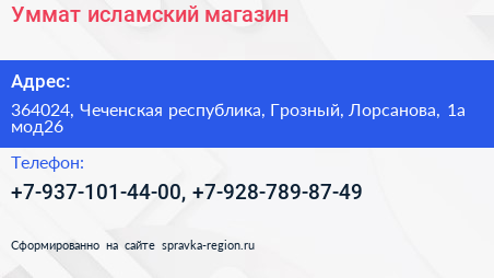 Уммат, исламский магазин по адресу 364024, Чеченская республика, Грозный, Лорсанова, 1а мод26 в дальнейшем Организация, размещена в следующих категориях: