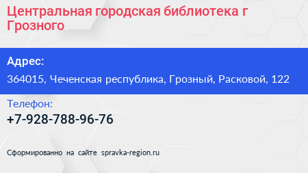 Центральная городская библиотека г. Грозного по адресу 364015, Чеченская республика, Грозный, Расковой, 122 в дальнейшем Организация, размещена в следующих категориях: