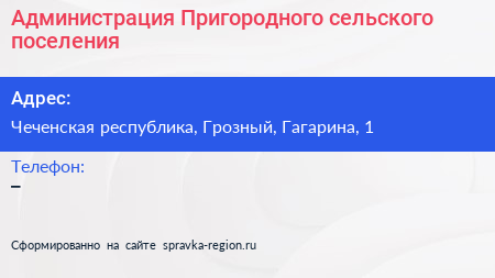 Администрация Пригородного сельского поселения по адресу Чеченская республика, Грозный, Гагарина, 1 в дальнейшем Организация, размещена в следующих категориях: