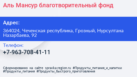 Аль-Мансур, благотворительный фонд по адресу 364024, Чеченская республика, Грозный, Нурсултана Назарбаева, 92 в дальнейшем Организация, размещена в следующих категориях: