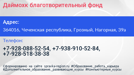 Даймохк, благотворительный фонд по адресу 364016, Чеченская республика, Грозный, Нагорная, 39а в дальнейшем Организация, размещена в следующих категориях: