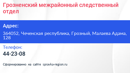 Грозненский межрайонный следственный отдел по адресу 364052, Чеченская республика, Грозный, Малаева Адама, 128 в дальнейшем Организация, размещена в следующих категориях: