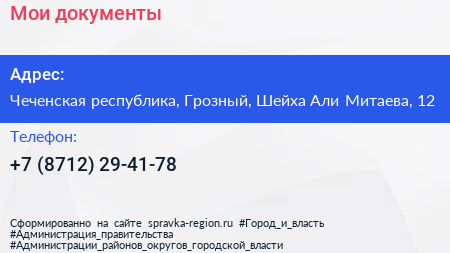 Мои документы по адресу Чеченская республика, Грозный, Шейха Али Митаева, 12 в дальнейшем Организация, размещена в следующих категориях: