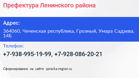 Префектура Ленинского района по адресу 364060, Чеченская республика, Грозный, Умара Садаева, 14Б в дальнейшем Организация, размещена в следующих категориях:
