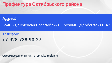 Префектура Октябрьского района по адресу 364030, Чеченская республика, Грозный, Дербентская, 42 в дальнейшем Организация, размещена в следующих категориях: