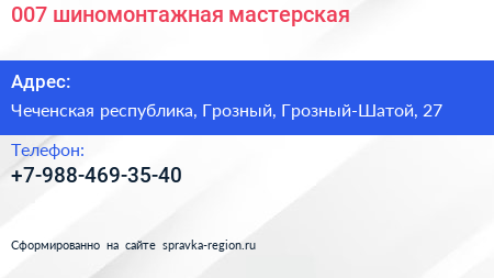 007, шиномонтажная мастерская по адресу Чеченская республика, Грозный, Грозный-Шатой, 27 в дальнейшем Организация, размещена в следующих категориях: