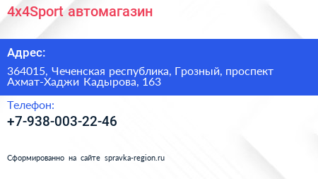 4x4Sport, автомагазин по адресу 364015, Чеченская республика, Грозный, проспект Ахмат-Хаджи Кадырова, 163 в дальнейшем Организация, размещена в следующих категориях: