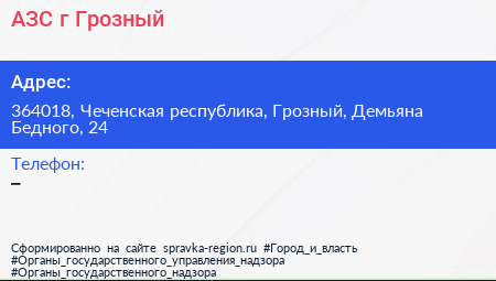 АЗС, г. Грозный по адресу 364018, Чеченская республика, Грозный, Демьяна Бедного, 24 в дальнейшем Организация, размещена в следующих категориях: