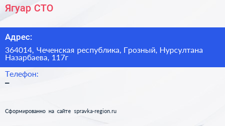 Ягуар, СТО по адресу 364014, Чеченская республика, Грозный, Нурсултана Назарбаева, 117г в дальнейшем Организация, размещена в следующих категориях: