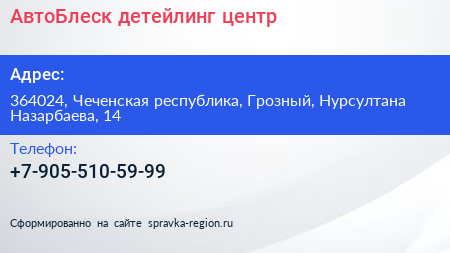 АвтоБлеск, детейлинг-центр по адресу 364024, Чеченская республика, Грозный, Нурсултана Назарбаева, 14 в дальнейшем Организация, размещена в следующих категориях: