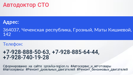 Автодоктор, СТО по адресу 364037, Чеченская республика, Грозный, Маты Кишиевой, 142 в дальнейшем Организация, размещена в следующих категориях: