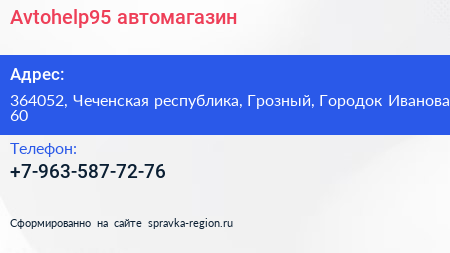 Avtohelp95, автомагазин по адресу 364052, Чеченская республика, Грозный, Городок Иванова, 60 в дальнейшем Организация, размещена в следующих категориях:
