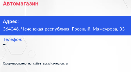 Автомагазин по адресу 364046, Чеченская республика, Грозный, Мамсурова, 33 в дальнейшем Организация, размещена в следующих категориях: