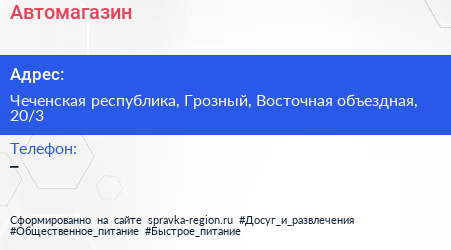 Автомагазин по адресу Чеченская республика, Грозный, Восточная объездная, 20/3 в дальнейшем Организация, размещена в следующих категориях: