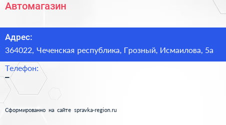 Автомагазин по адресу 364022, Чеченская республика, Грозный, Исмаилова, 5а в дальнейшем Организация, размещена в следующих категориях: