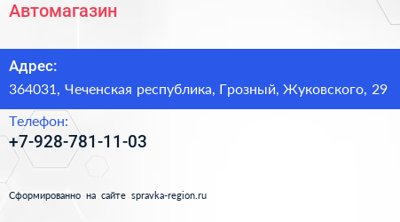 Автомагазин по адресу 364031, Чеченская республика, Грозный, Жуковского, 29 в дальнейшем Организация, размещена в следующих категориях: