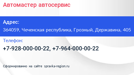 Автомастер, автосервис по адресу 364059, Чеченская республика, Грозный, Державина, 405 в дальнейшем Организация, размещена в следующих категориях: