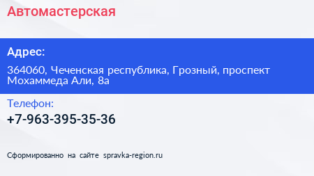 Автомастерская по адресу 364060, Чеченская республика, Грозный, проспект Мохаммеда Али, 8а в дальнейшем Организация, размещена в следующих категориях: