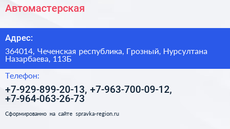 Автомастерская по адресу 364014, Чеченская республика, Грозный, Нурсултана Назарбаева, 113Б в дальнейшем Организация, размещена в следующих категориях: