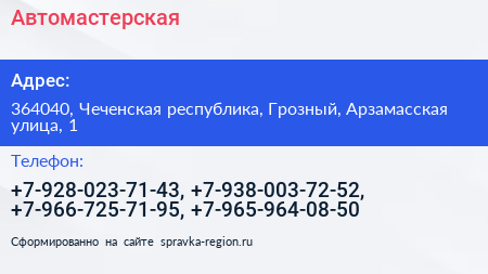 Автомастерская по адресу 364040, Чеченская республика, Грозный, Арзамасская улица, 1 в дальнейшем Организация, размещена в следующих категориях: