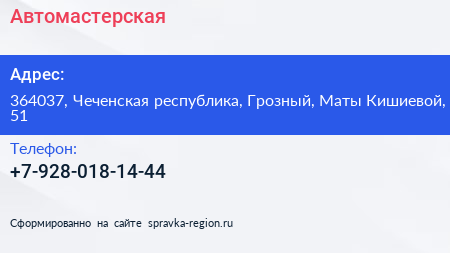 Автомастерская по адресу 364037, Чеченская республика, Грозный, Маты Кишиевой, 51 в дальнейшем Организация, размещена в следующих категориях: