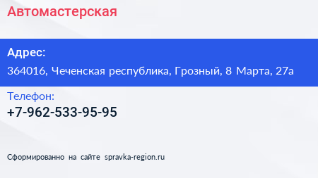 Автомастерская по адресу 364016, Чеченская республика, Грозный, 8 Марта, 27а в дальнейшем Организация, размещена в следующих категориях: