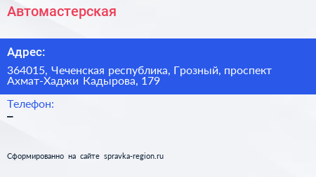 Автомастерская по адресу 364015, Чеченская республика, Грозный, проспект Ахмат-Хаджи Кадырова, 179 в дальнейшем Организация, размещена в следующих категориях: