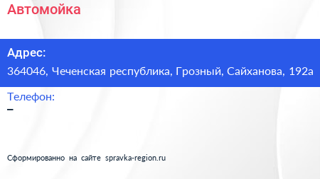 Автомойка по адресу 364046, Чеченская республика, Грозный, Сайханова, 192а в дальнейшем Организация, размещена в следующих категориях: