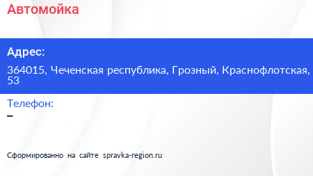 Автомойка по адресу 364015, Чеченская республика, Грозный, Краснофлотская, 53 в дальнейшем Организация, размещена в следующих категориях: