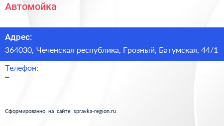 Автомойка по адресу 364030, Чеченская республика, Грозный, Батумская, 44/1 в дальнейшем Организация, размещена в следующих категориях: