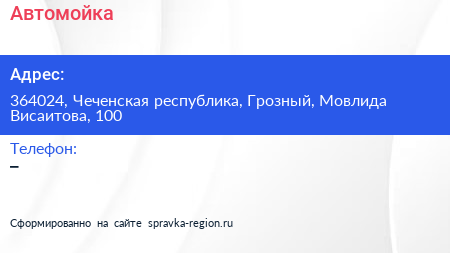 Автомойка по адресу 364024, Чеченская республика, Грозный, Мовлида Висаитова, 100 в дальнейшем Организация, размещена в следующих категориях: