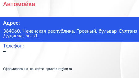 Автомойка по адресу 364060, Чеченская республика, Грозный, бульвар Султана Дудаева, 5в к1 в дальнейшем Организация, размещена в следующих категориях:
