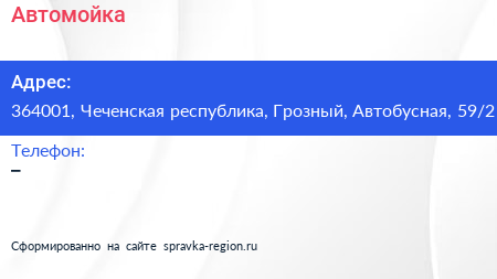 Автомойка по адресу 364001, Чеченская республика, Грозный, Автобусная, 59/2 в дальнейшем Организация, размещена в следующих категориях: