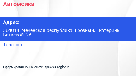 Автомойка по адресу 364014, Чеченская республика, Грозный, Екатерины Батаевой, 26 в дальнейшем Организация, размещена в следующих категориях: