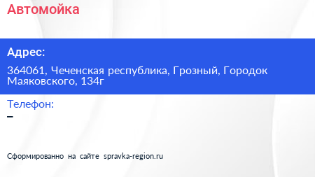 Автомойка по адресу 364061, Чеченская республика, Грозный, Городок Маяковского, 134г в дальнейшем Организация, размещена в следующих категориях: