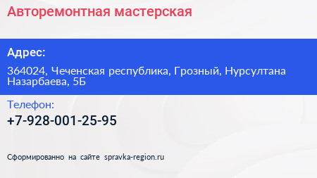 Авторемонтная мастерская по адресу 364024, Чеченская республика, Грозный, Нурсултана Назарбаева, 5Б в дальнейшем Организация, размещена в следующих категориях: