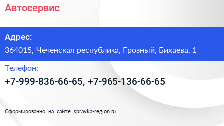 Автосервис по адресу 364015, Чеченская республика, Грозный, Бихаева, 1 в дальнейшем Организация, размещена в следующих категориях:
