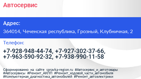 Автосервис по адресу 364014, Чеченская республика, Грозный, Клубничная, 2 в дальнейшем Организация, размещена в следующих категориях: